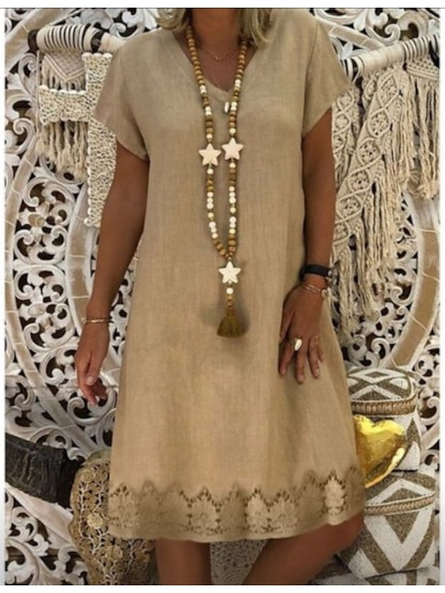 - Perfect for summer: Stay cool and comfortable in this beautiful midi dress.- Short sleeve design allows for extra breathability during the warm season.- Designed specifically for women's style and fit.- Eye-catching V-neckline adds a touch of elegance.- Stylish midi dress length is perfect for any occasion.