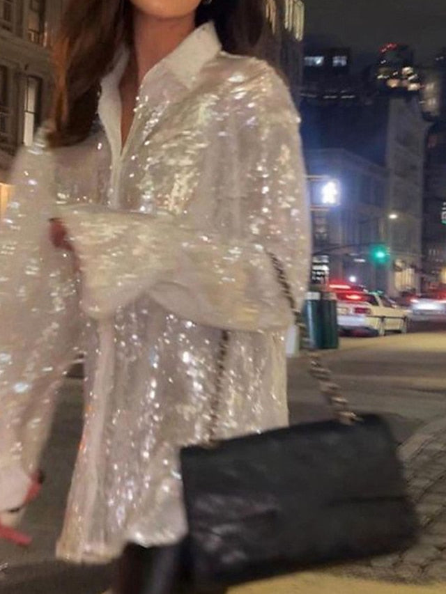 Women's Dress - Shirt Dress Holiday Dress Silver Long Sleeve Pure Color Sequins Button Winter Fall Shirt Collar Stylish Casual Modern Fall Dress 2023 S M L XL / Winter Dress