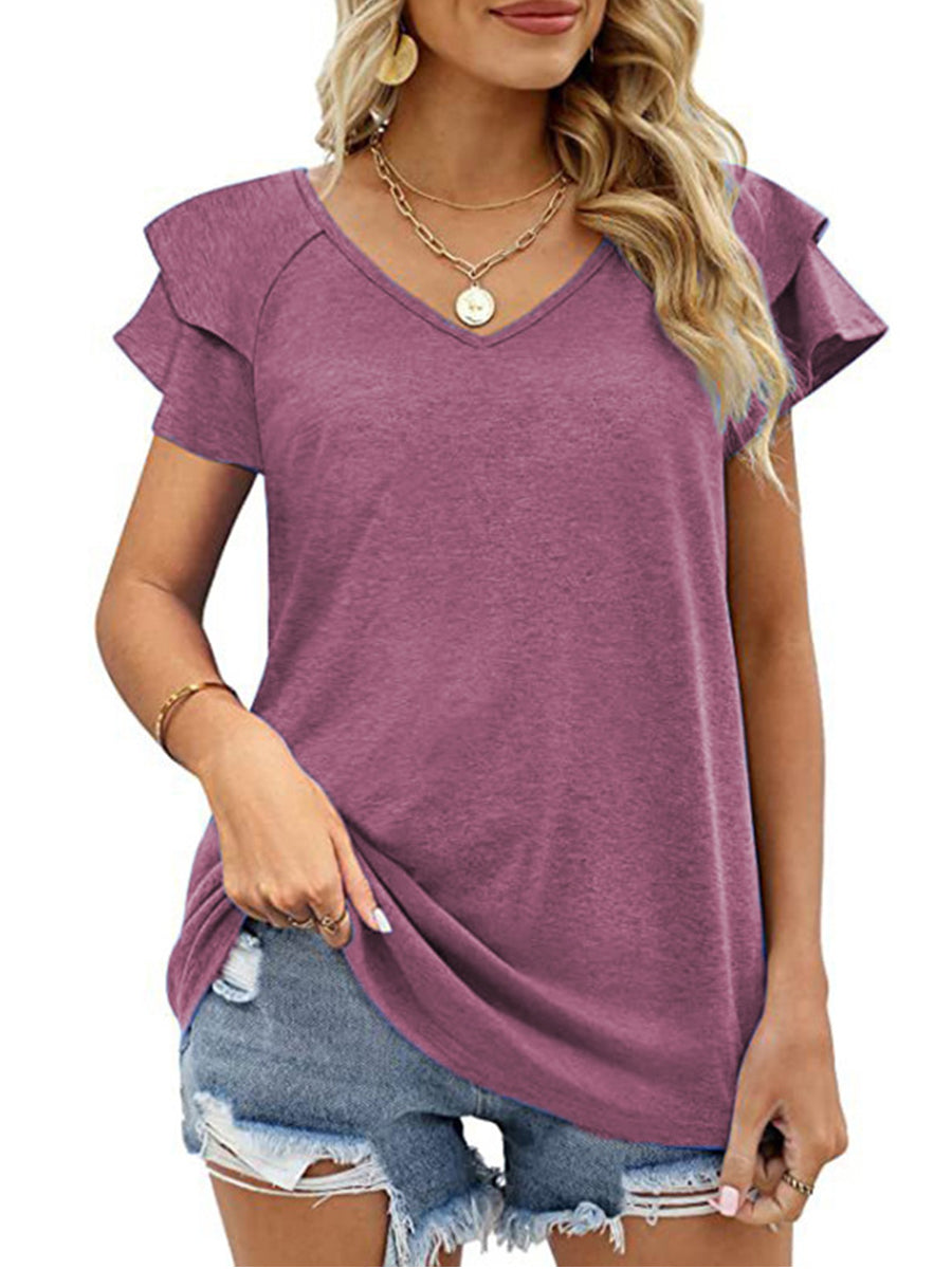 Exclusive to MsDressly®! Elevate your everyday style with this Women’s Solid Color V-Neck Ruffled Sleeves Loose T-Shirt. The V-neck design and ruffled sleeves add a fashionable twist to the classic T-shirt.