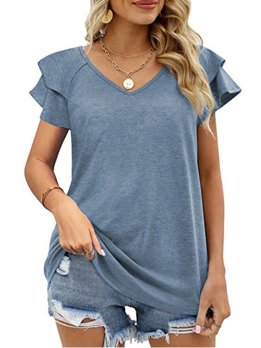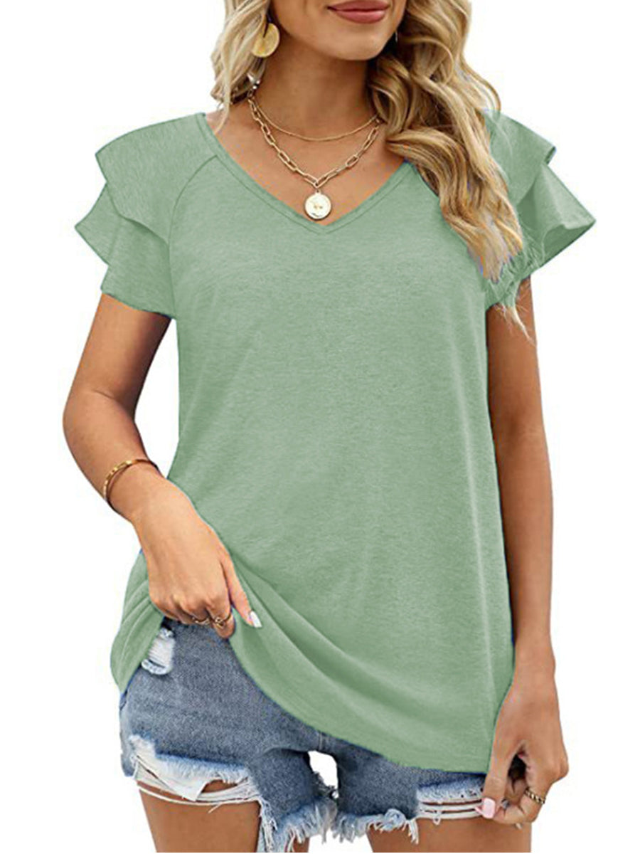 Solid Color V-Neck Ruffled Sleeves Loose T-Shirt