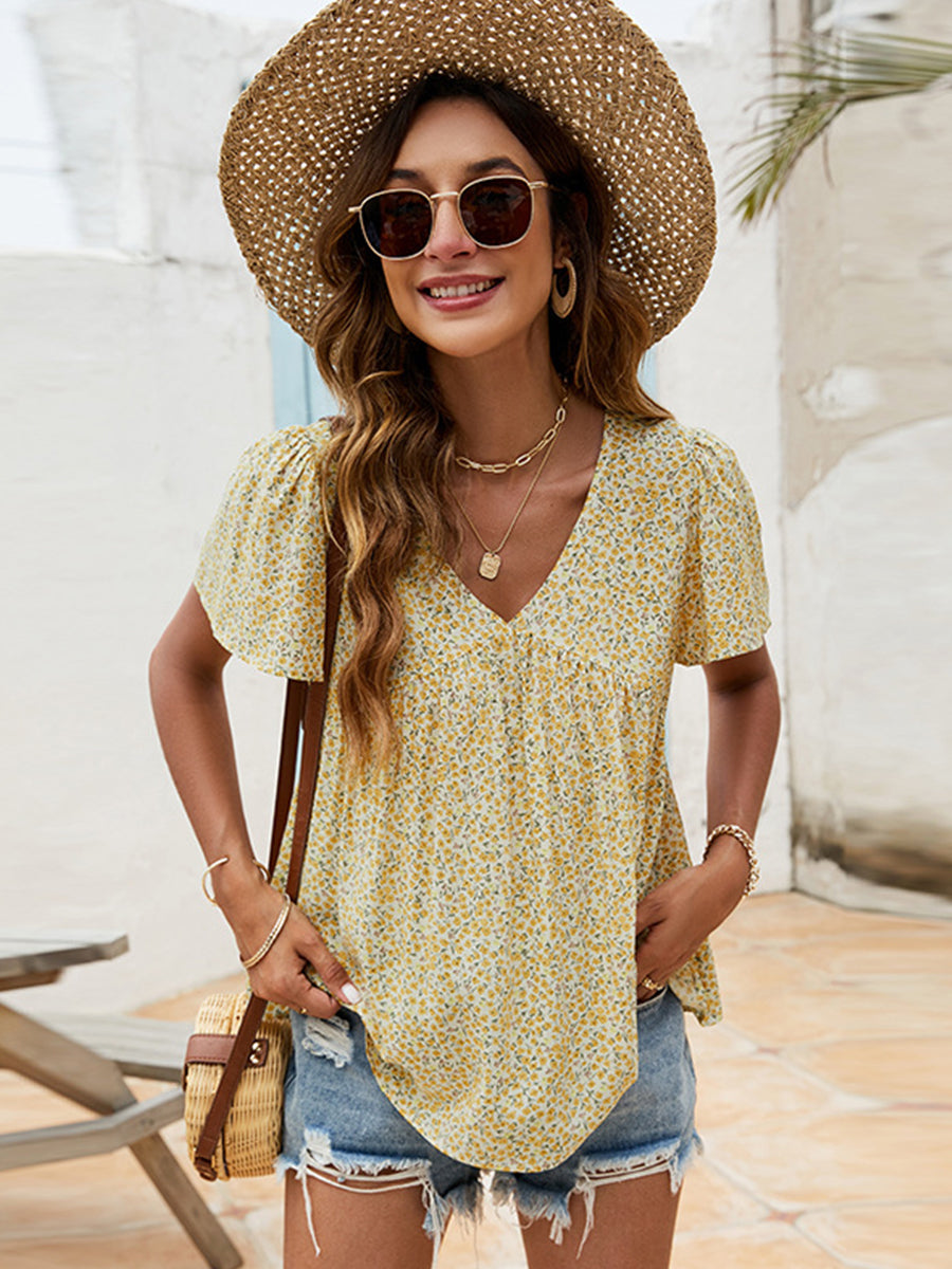 V-Neck Floral Printed Pattern Short Sleeve Loose Casual T-Shirt