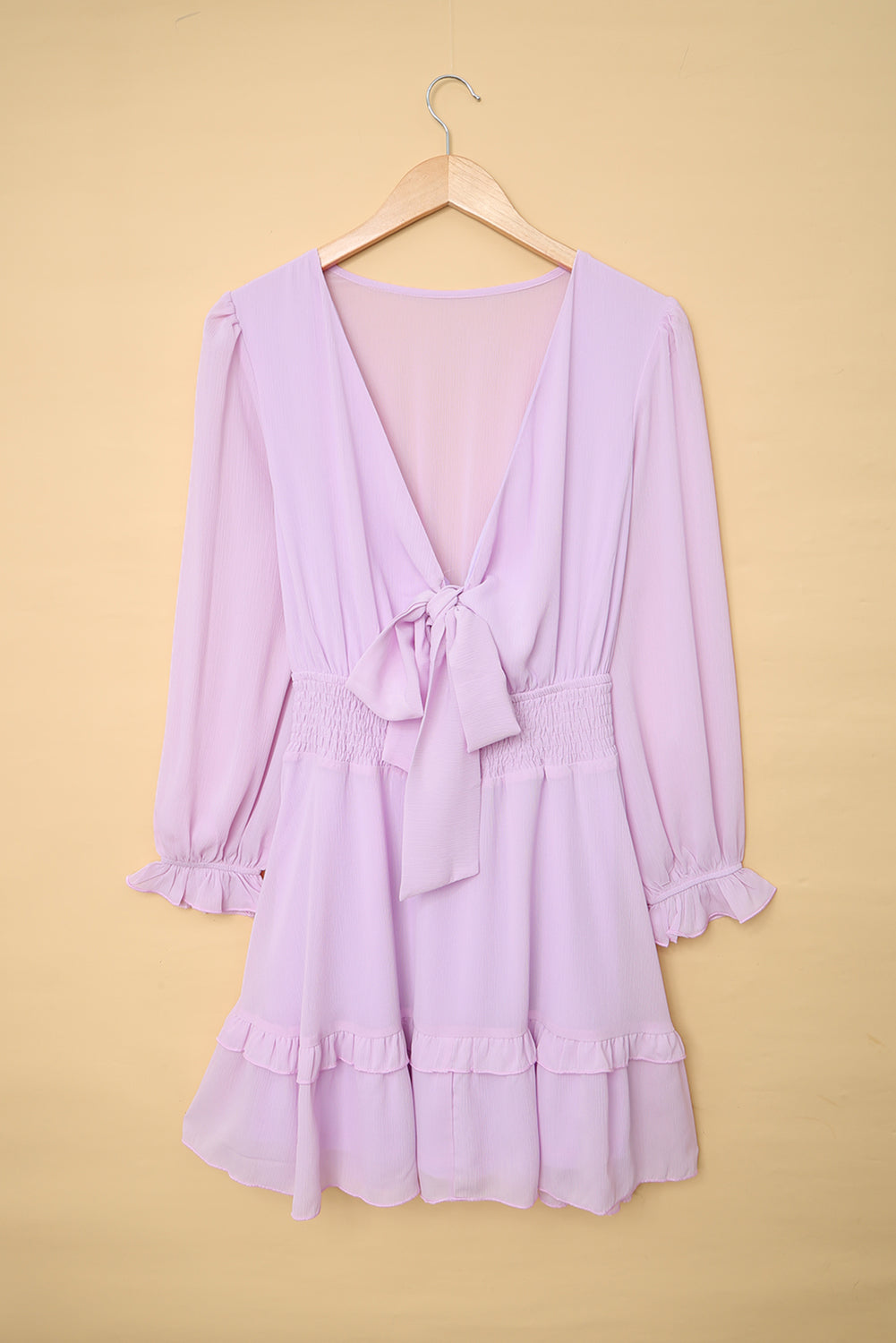 Printed Waist Strap V Neck Long Sleeved Mini Dress