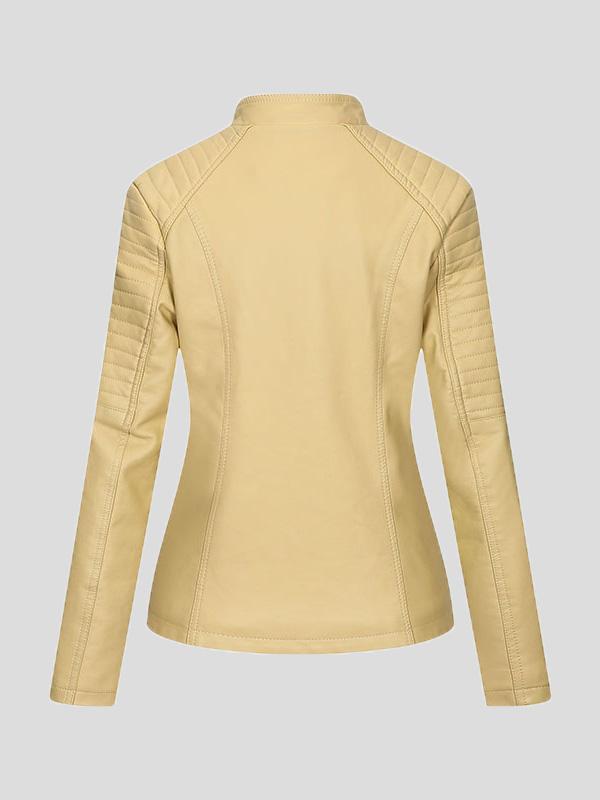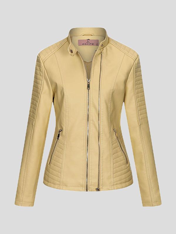Upgrade your style game with our Temperament Slim Zipped Leather Jacket, designed to elevate your casual or fashion-forward looks. Crafted with high-quality polyester, this jacket boasts a slim fit and features a convenient zipper closure and long sleeves for a sleek and modern appeal. Available in black, light yellow, gray, light green, and pink, you can choose the color that suits your personality. The sizes range from M to 2XL, ensuring a comfortable and flattering fit for women of various body types. For your convenience, we offer free shipping on orders over $100. Please note that the sizing runs a little small, so we recommend sizing up to ensure the perfect fit. Kindly bear in mind that all dimensions are measured manually with a deviation of 1 to 3cm. Elevate your wardrobe with this stylish and versatile jacket. Add a touch of sophistication to your ensemble and make a statement wherever you go!