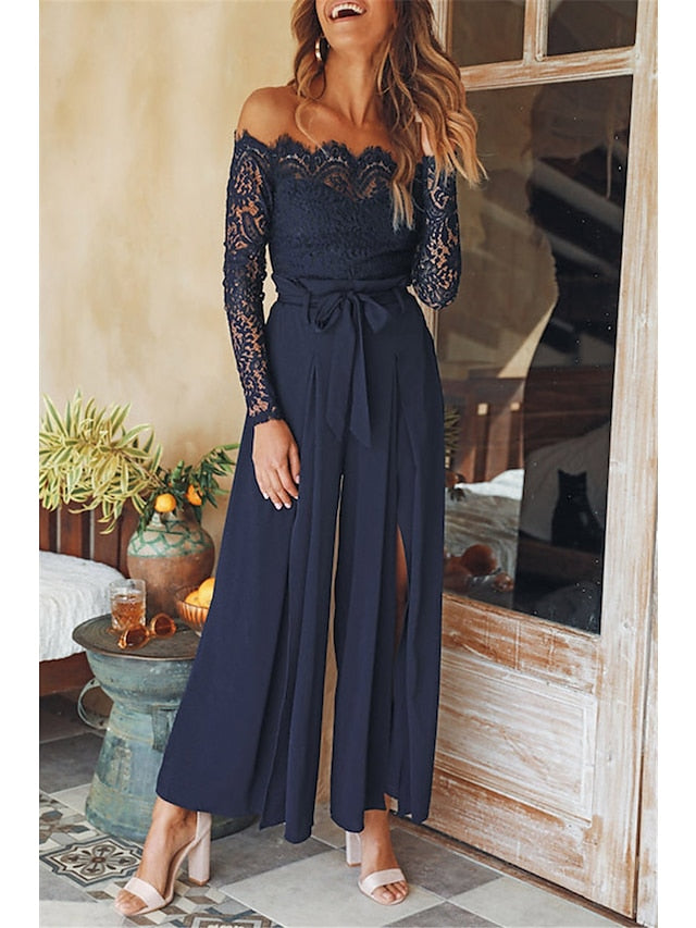 Women's Jumpsuit Lace Backless Solid Color Off Shoulder Streetwear Going out Bar Regular Fit Long Sleeve Navy Blue S M L Winter