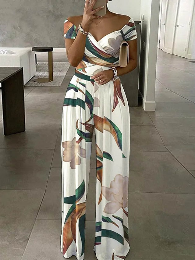 Women's Jumpsuit V-Neck Print Floral Off Shoulder Streetwear Party Regular Fit Short Sleeve White S M L Spring