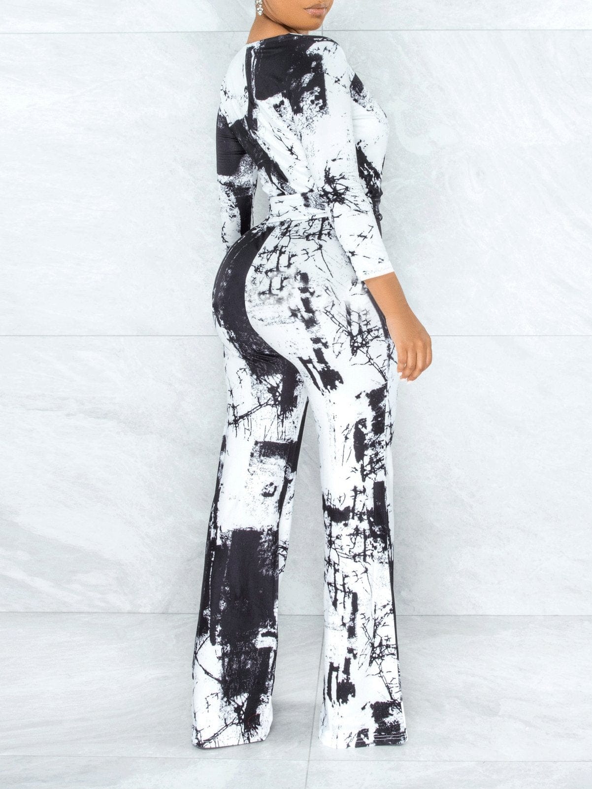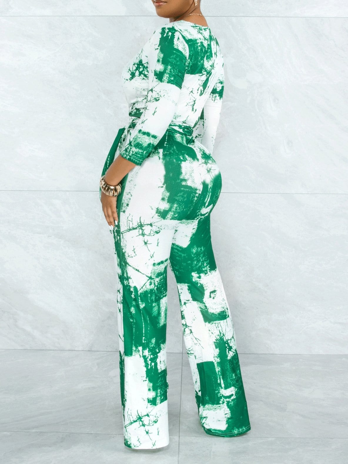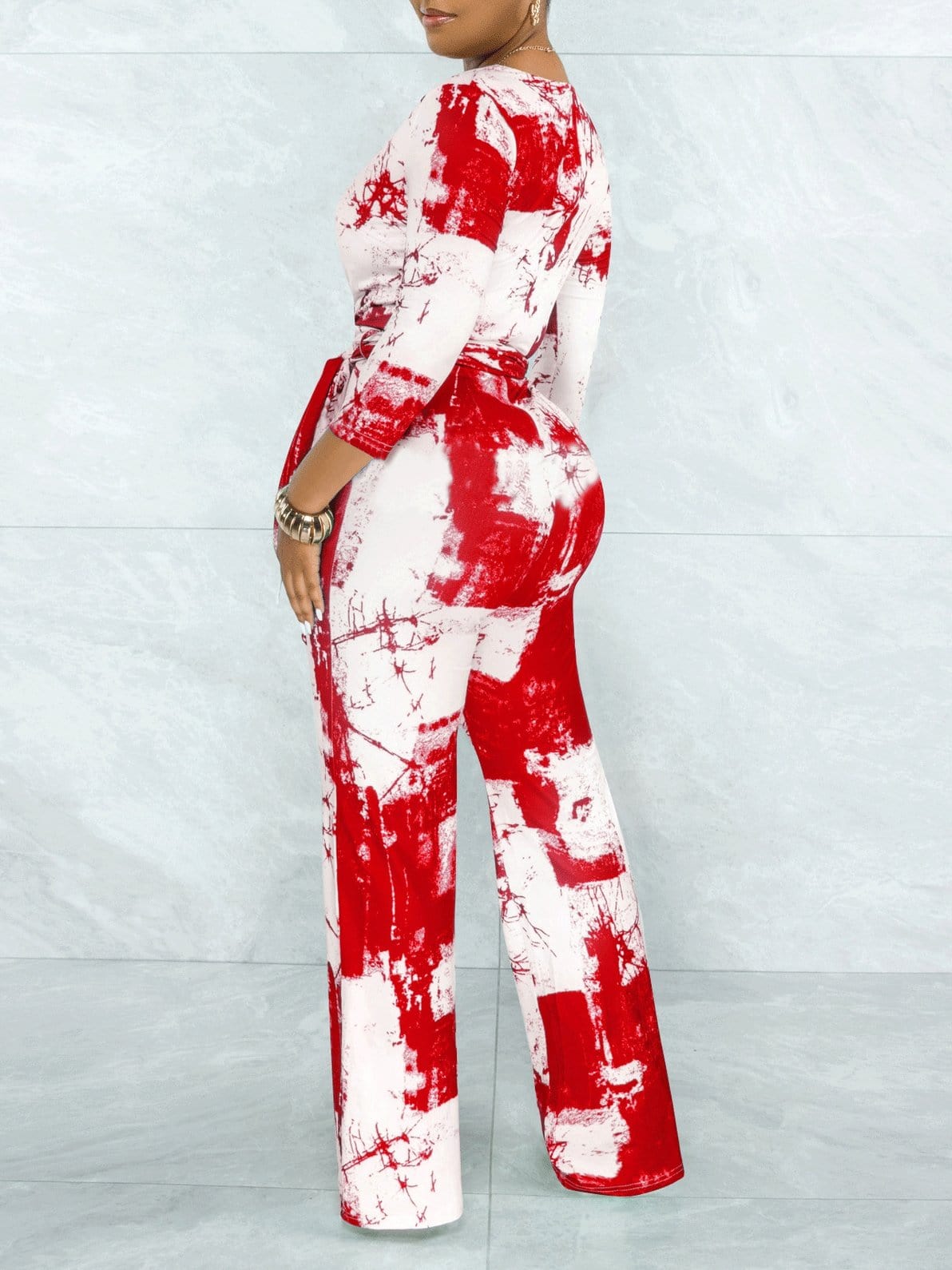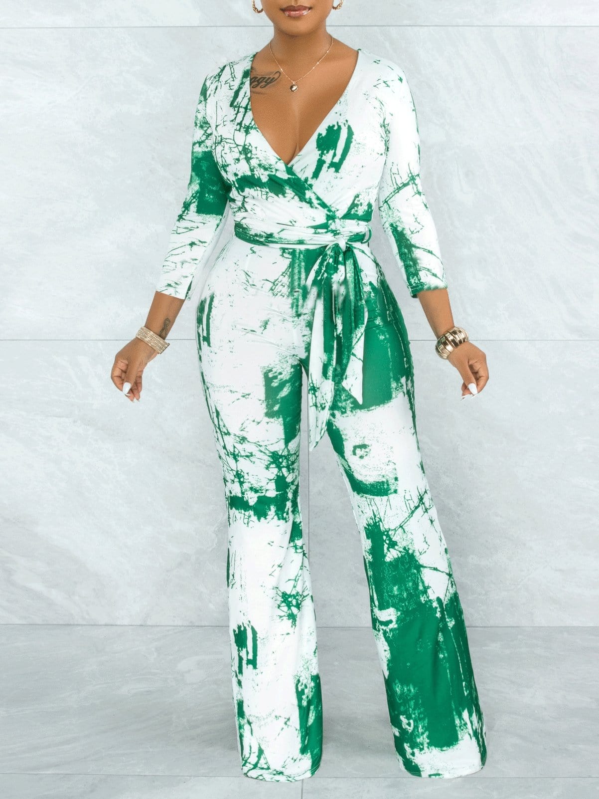 Tie-Dye V-Neck Long Sleeve Belt Wide Leg Jumpsuit