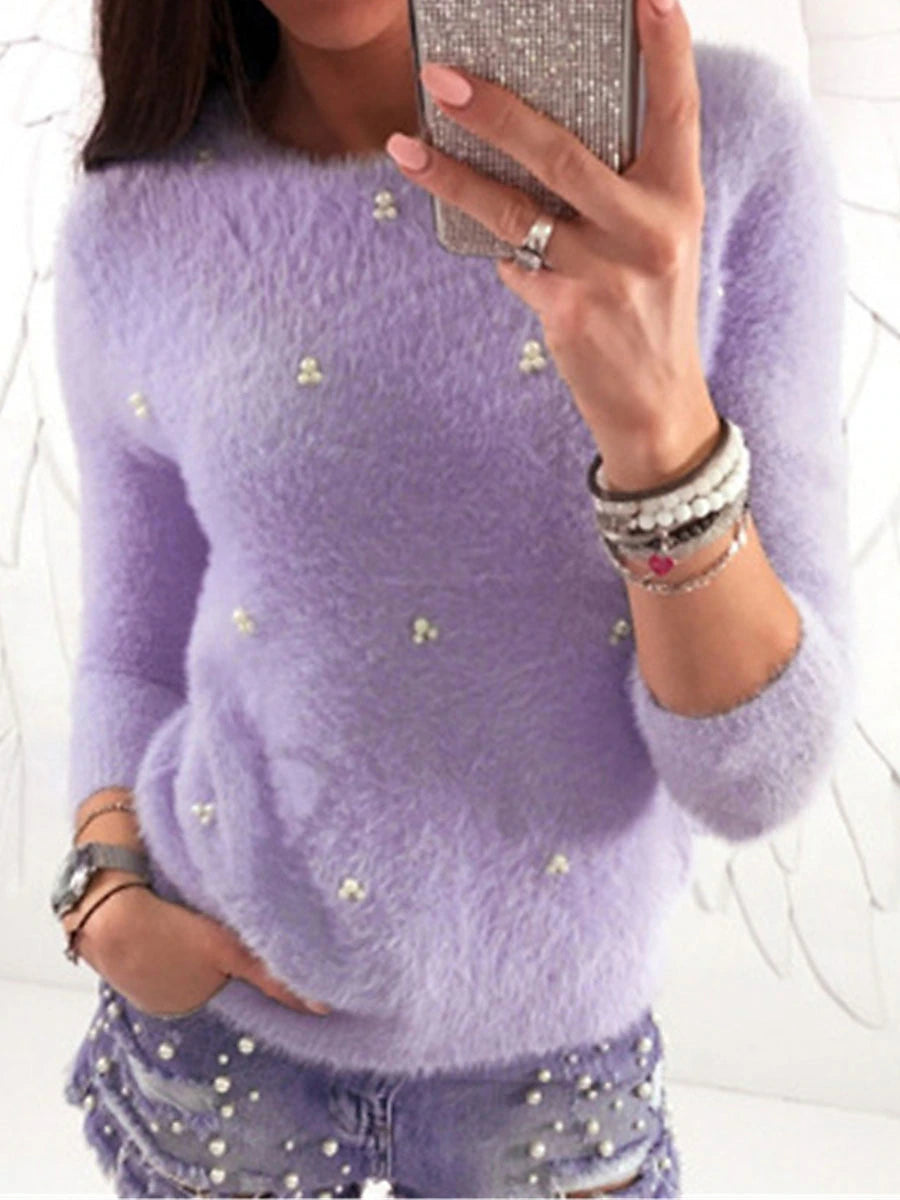 Women's Pullover Sweater Jumper Crew Neck Ribbed Knit Acrylic Beads Fall Winter Regular Outdoor Daily Going out Stylish Casual Soft Long Sleeve Solid Color Black White Pink XS S M