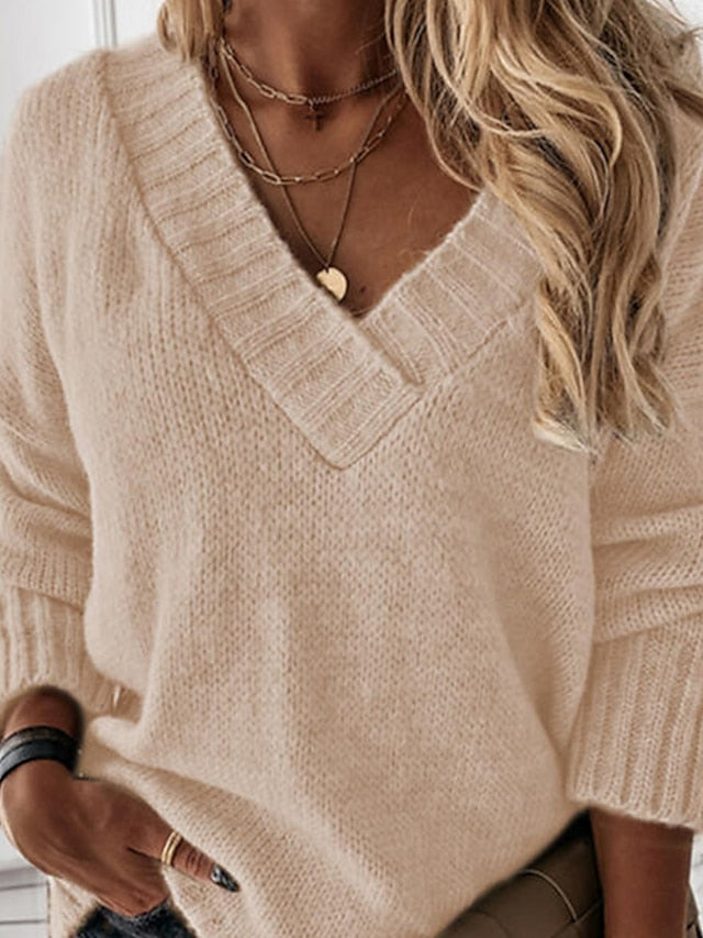 Women's Pullover Sweater jumper Jumper Ribbed Knit Knitted Pure Color V Neck Stylish Casual Holiday Going out Winter Fall Blue Khaki S M L / Long Sleeve / Regular Fit