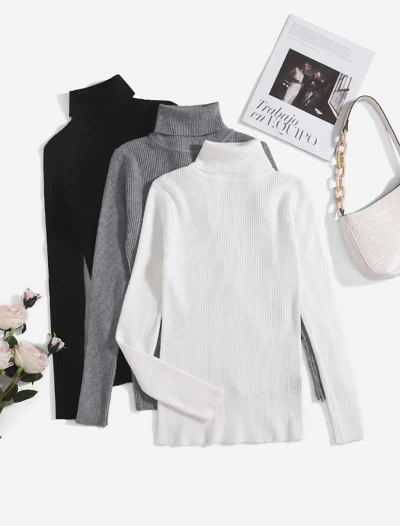 Women's Pullover Sweater Jumper Turtleneck Ribbed Knit Spandex Knitted Thin Fall Winter Daily Basic Casual Long Sleeve Solid Color Black+White+Gray Black+Apricot+Brown Black+White+Dark Green One-Size
