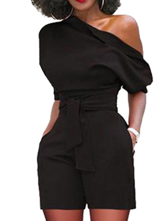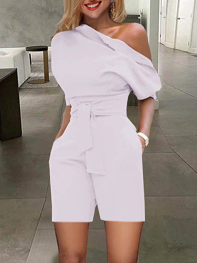Women's Romper Lace up Backless Solid Color One Shoulder Casual Holiday Weekend Regular Fit Half Sleeve Yellow Red White S M L Spring