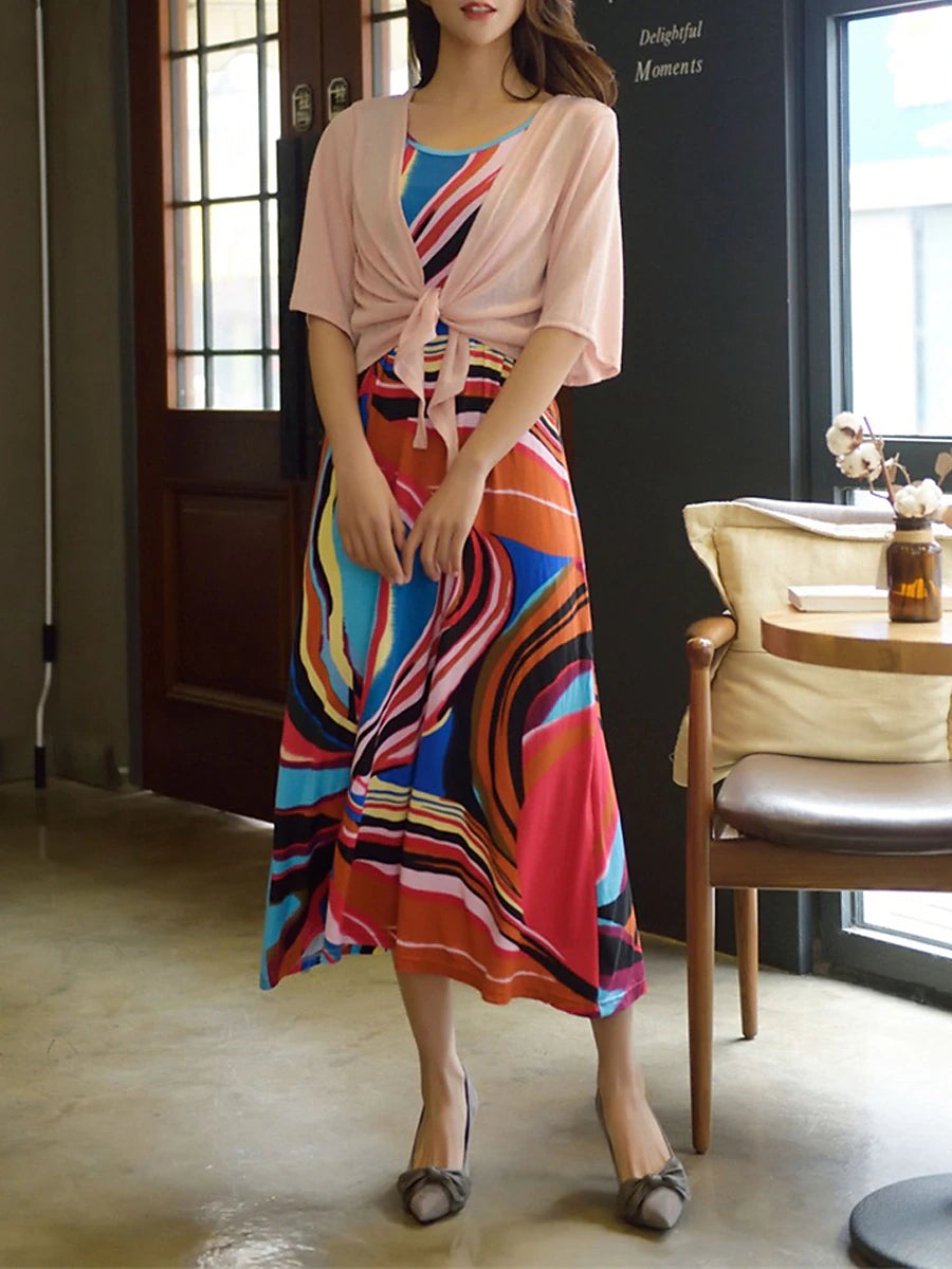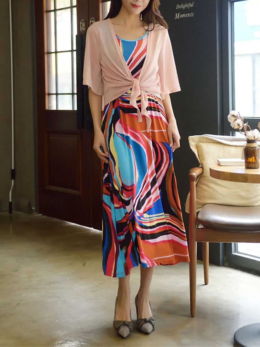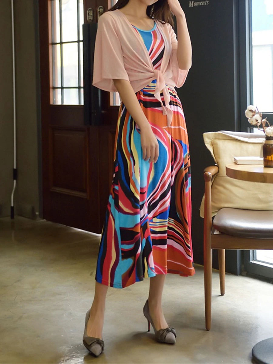 Women's Floral Apricot Striped Puff Dress with 3/4 Sleeves – Chic and Comfortable for Spring and Summer Adventures