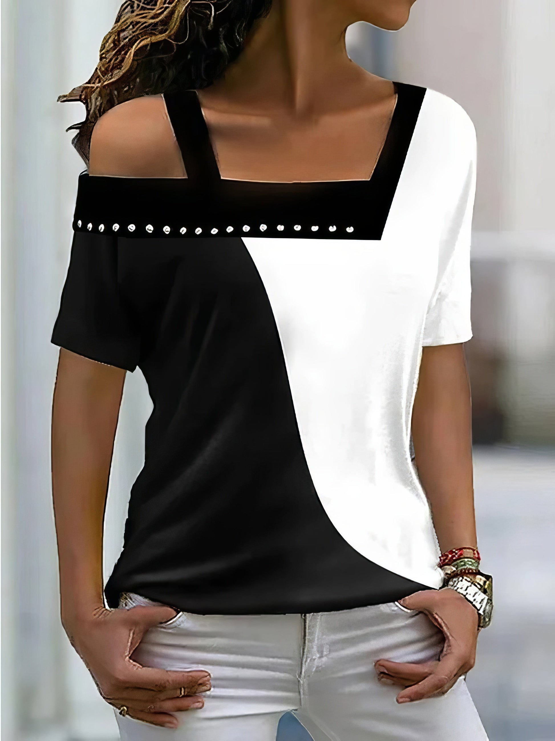 Upgrade your wardrobe with our Irregular Neck Contrast Color Short Sleeve T-Shirt! This trendy t-shirt is designed to elevate your casual look and keep you comfortable throughout the day.