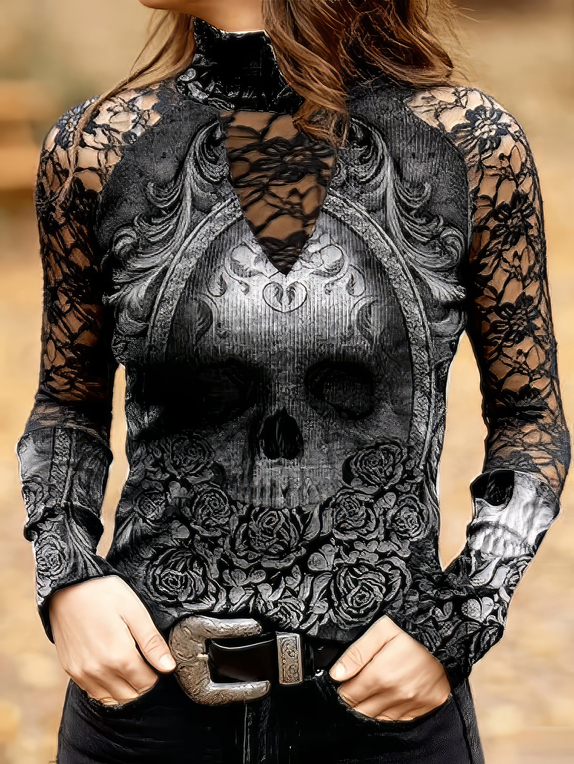 Upgrade your casual wardrobe with our Lace Skull Print Long Sleeve T-Shirt. With a slim fit and stylish lace skull print, this t-shirt adds a unique and edgy touch to your everyday look.