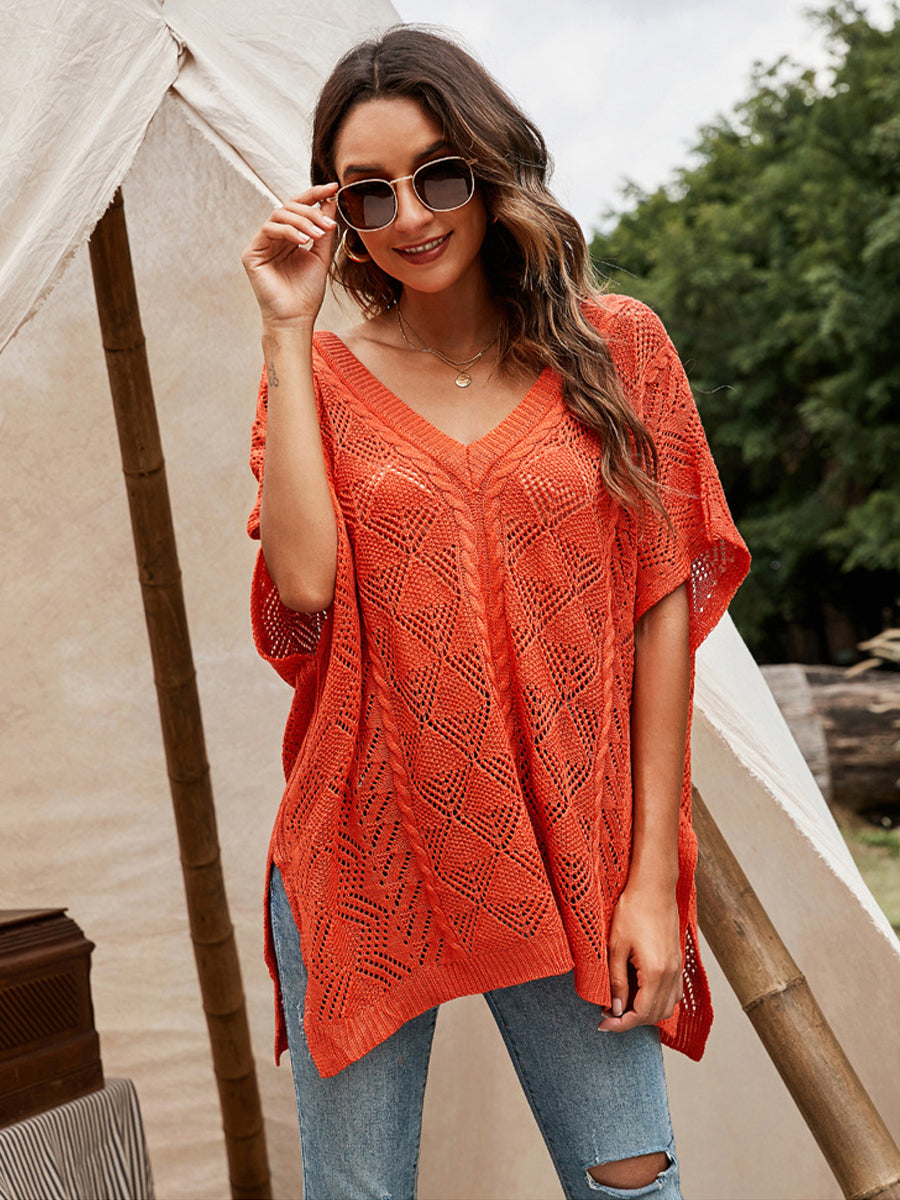 Loose Solid Color V-Neck Hollowed Short Sleeve Knitted T-Shirt