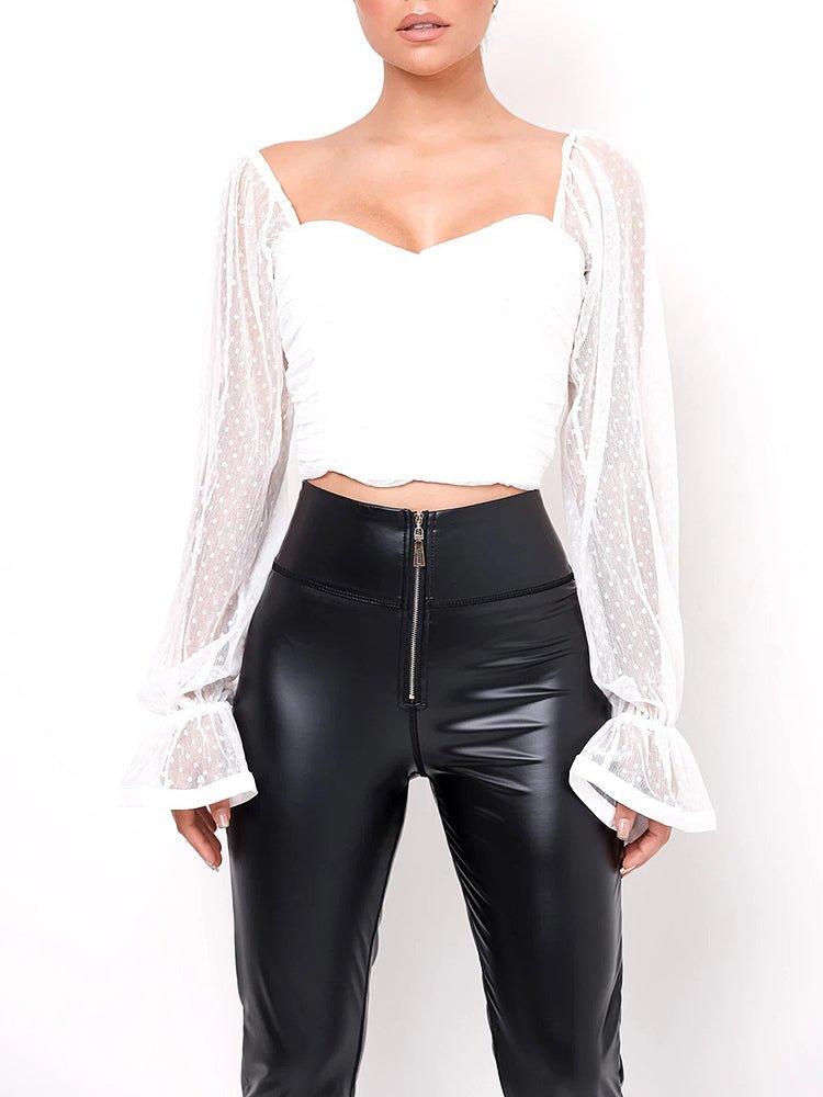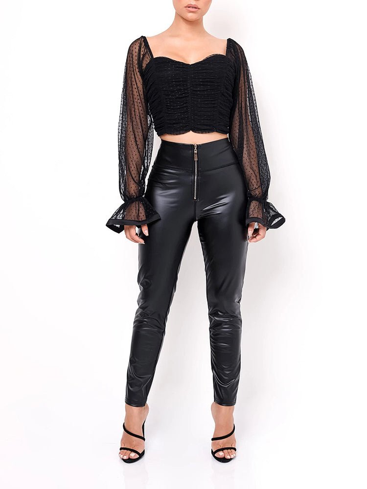MsDressly® Exclusive! Throw on the MsDressly® Sexy Chiffon Polka Dot Short Chiffon T-Shirt and get ready for a weekend of fun! Woven fabric shapes this top that has a V neckline, pleated bodice, and long sleeves with elastic cuffs. Pair with a mini skirt or fitted pants for a sexy night out!