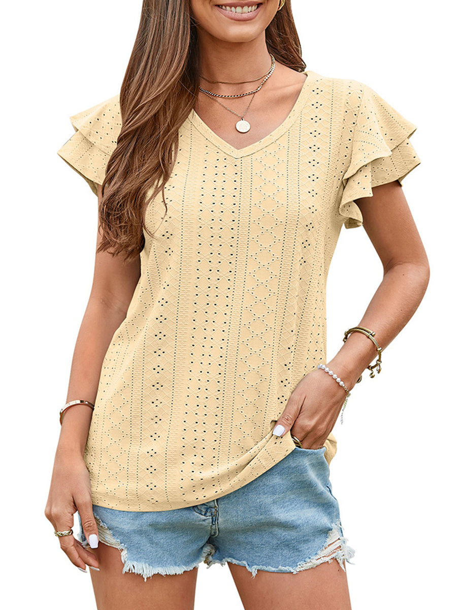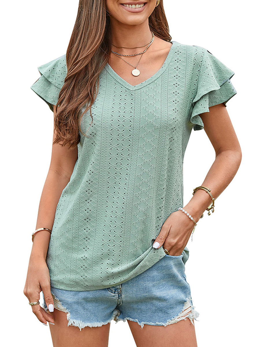 Upgrade your summer wardrobe with our Solid Color Hollowed-Out Lotus Leaf Sleeve Casual T-Shirt. Embrace comfort and style effortlessly!