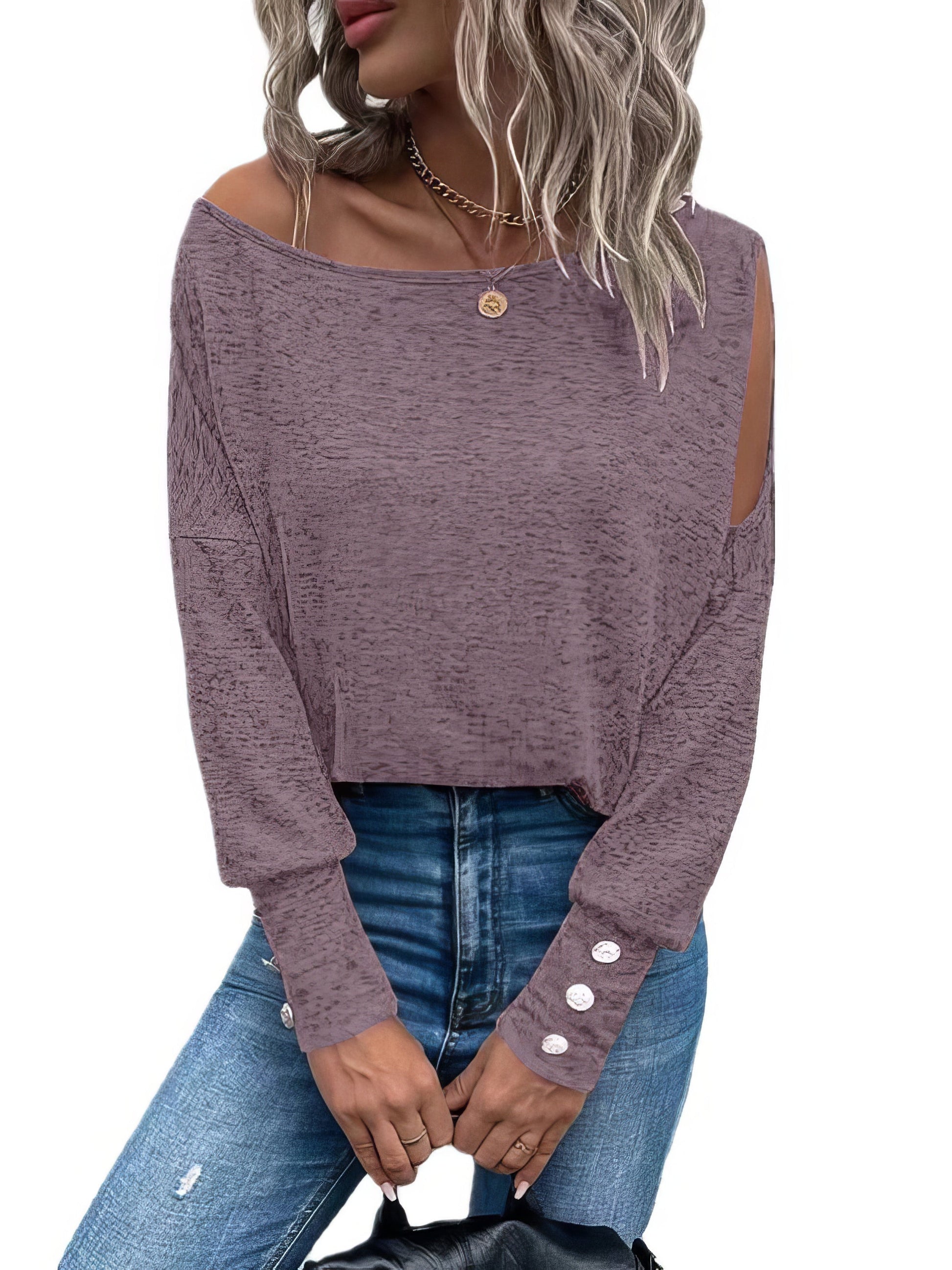 Solid Off Shoulder Long Sleeves Buttoned Cuff T-Shirt