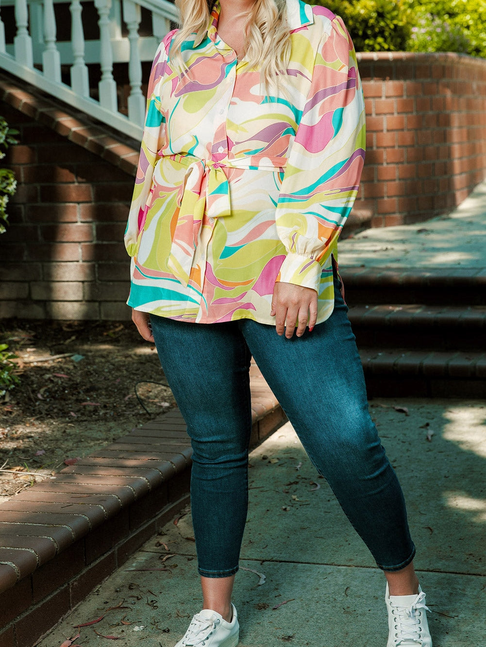During a formal family celebration, such as a wedding or anniversary, you arrive wearing the Sunny Plus Size Abstract Print Relaxed Tunic Blouse tucked into a classic A-line skirt. The tunic's modern design beautifully contrasts with the traditional setting, while its versatility shines through. You feel comfortable moving around, dancing, and embracing family members, all while looking elegant and chic. The bold print allows you to express your personality while fitting into the celebratory atmosphere, making you feel both stylish and at ease.
