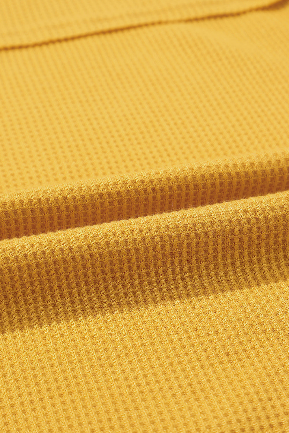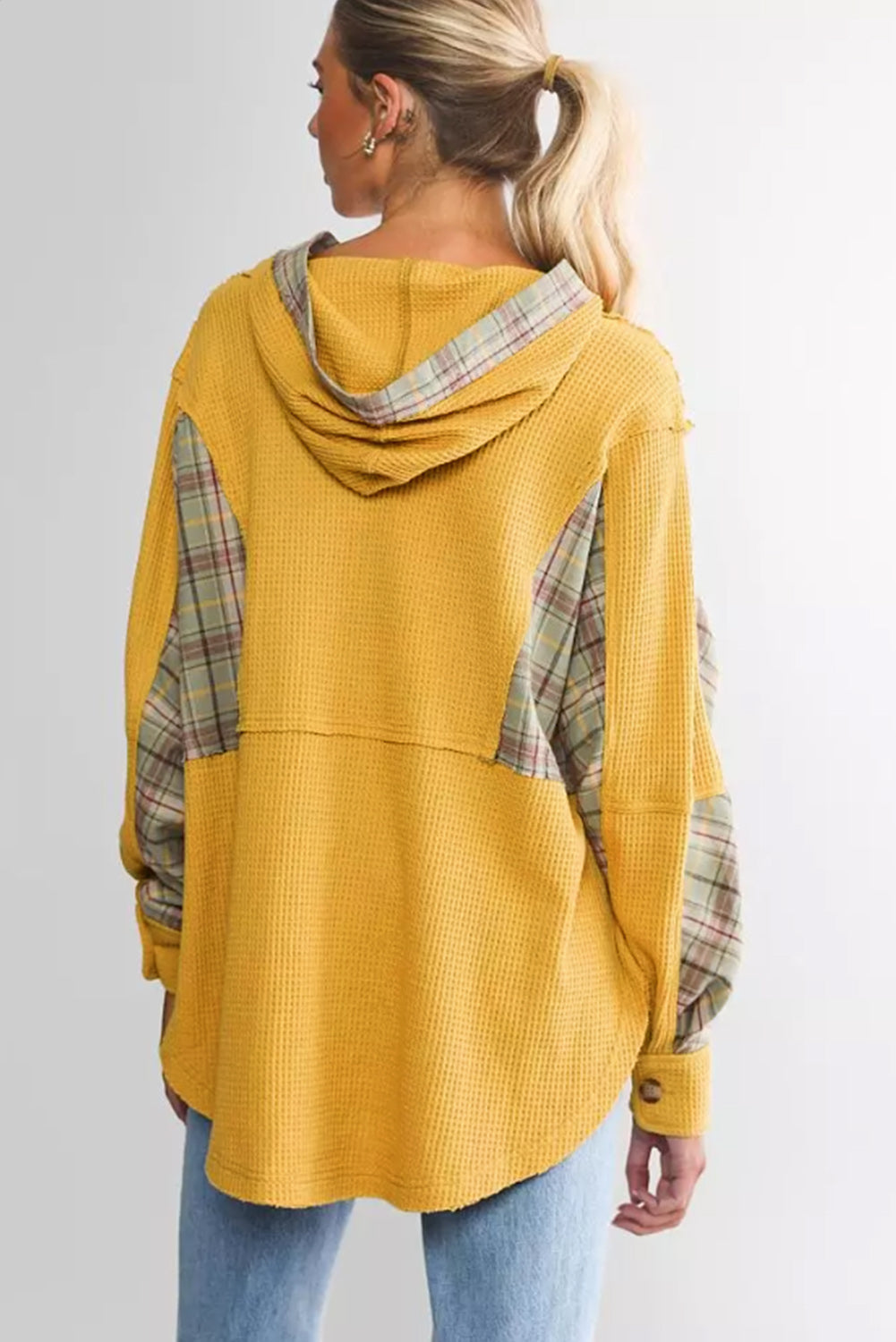 Stay Cozy and Stylish with Our Yellow Waffle Knit Plaid Patchwork Pocketed Henley Hoodie